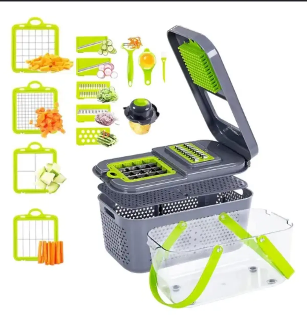 La Mandolina Picadora 22 en 1 es la herramienta definitiva para agilizar tus recetas. Diseñada para cortar frutas y verduras en segundos, combina funcionalidad, seguridad y practicidad en un solo producto.