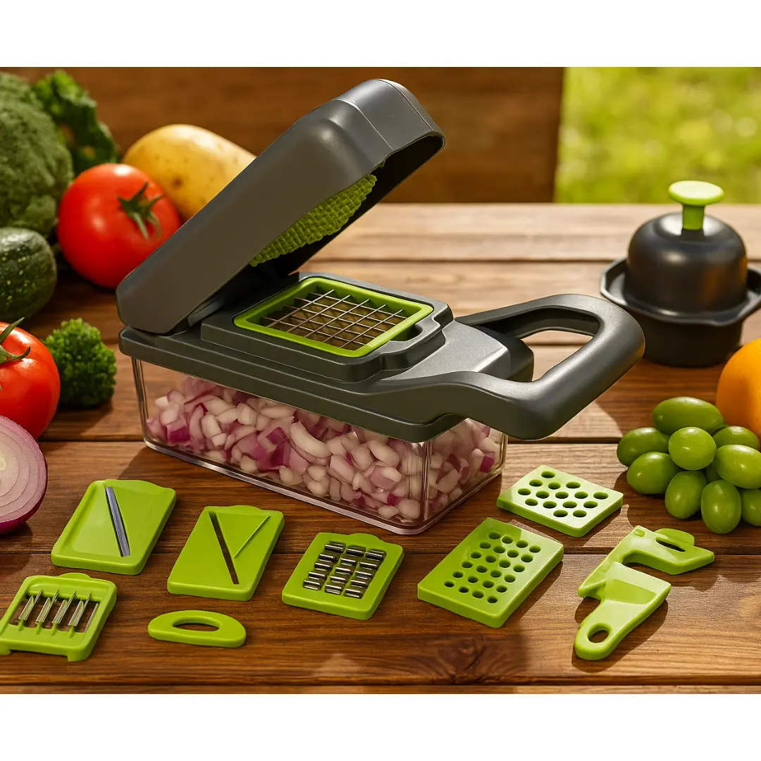 Prepará tus comidas en minutos. Esta mandolina 22 en 1 corta, pica, rebana y ralla con precisión. Incluye 13 cuchillas de acero inoxidable, protector de manos y contenedor. Ideal para cocina rápida, segura y ordenada.